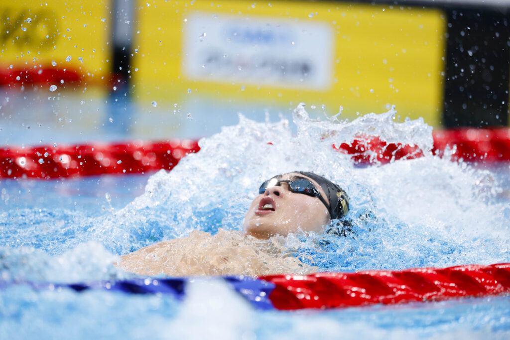 女子200m平泳ぎは、前半こそ楠田夢乃(藤村SS/中央大学)がリードしていたが、ラスト50mで一気に加藤心冨(スウィン鴻巣/早稲田大学)が楠田を抜き去りフィニッシュ。2分20秒69で優勝し、100mに続いて優勝を果たしてこちらも2冠を達成した。