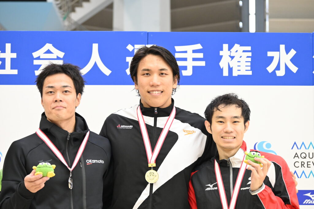 男子200m個人メドレーは溝畑樹蘭(ミツウロコ/三菱養和SS)が2分02秒27で制し、さらに最後の4×100mメドレーリレーも川端陸椰、山本聖漣、寺田拓未、そして溝畑の4人で自衛隊体育学校、JFE京浜との接戦を3分38秒35で制して優勝。