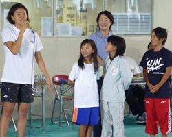 あいにくの小雨模様だったが、参加者たちはそんなことは忘れたかのように、熱心に柴田さんの話に聞き入った。「姿勢がきれいだと良い泳ぎができる」「ばた足は水面ではなく水中でしっかり蹴る」「腕は丸めずしっかり伸ばしてかく」などなど。藤沢市から参加した山田拓昂君(ひろあき、六会小3年)は「手を伸ばして大きくかくことの大切さが分かった」と、早くもその効果を実感した。