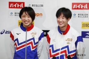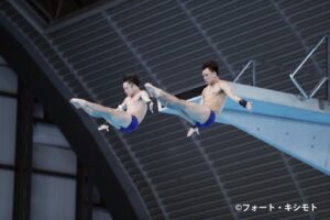 男子の10mシンクロナイズドでは、村上和基(三重県体育協会)と伊藤洸輝(日本大学)のペアが予選でトップの得点をマーク。それにわずか3.12ポイント差で続くのが、西田玲雄(近畿大学)と金子舜汰(セントラルスポーツ)のふたり。