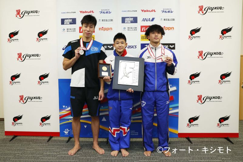 その隙にトップに立ったのは、昨年の日本選手権の高飛込をを史上最年少で制した玉井陸斗(JSS宝塚)。「身長も体重も増えたのと、プールが使えないときに脚を中心に鍛えたことで、板が踏みやすくなった」と、玉井は高飛込だけではなく、飛板飛込でも難易率の高い演技が可能になった。須山のミスの隙にトップにたった玉井は、3本目の205Bで入水が乱れるものの、4本目以降は得意の入水もぴたりとはまり、439.35で初優勝。昨年の高飛込に続き、3m飛板飛込でも最年少優勝を果たした。