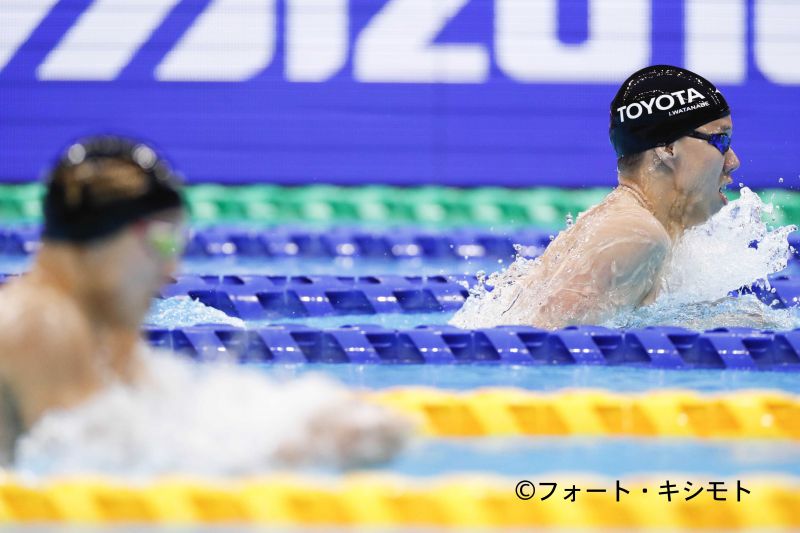 男子200m平泳ぎは、先行する佐藤翔馬(東京SC/慶應義塾大学)と追いかける渡辺一平(TOYOTA)の対決に。100mは世界記録を超えるペースで佐藤が先に折り返す。100mのターン後にじりじりとその差を詰めた渡辺は150mで逆転。ラスト50mはターン後に奪った頭ひとつのリードを守りきって2分07秒08で優勝。佐藤は2分07秒69の2位という結果となった。