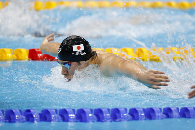 男子200mバタフライの準決勝には本多灯と瀬戸大也のふたりが出場。両者とも前半から攻める積極的なレースを展開。ラスト50m、ギアを入れ替えて追い込んで記録を伸ばしたのは、本多。1分55秒31の8位で決勝に進出した。