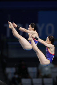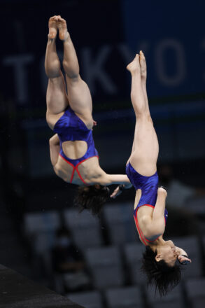 女子10mシンクロには、板橋美波と荒井祭里のふたりが登場。制限選択飛で入水を決めたふたりは4位に位置した。3本目の405Bでは64.68で順位をふたつ落としてしまうが、4本目の107Bでは演技、入水ともにシンクロしながら決めきったことで71.10の高得点をマーク。順位も一気に3位までジャンプアップ。メダル獲りが懸かった最後の5本目。緊張からか少し固くなってしまった演技で61.44となり、トータル291.42で3位までは8.28差の6位という結果となった。