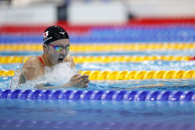 女子200m平泳ぎの渡部香生子は、後半の伸びを欠いてしまい2分24秒73の18位という結果となった。