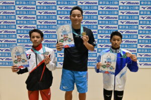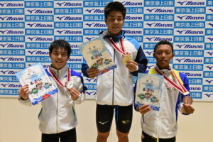 同区分男子400m個人メドレーは、山口哩駈(桃山学院)と松下知之(スウィン宇都宮)、上川畑英(イトマン港北)の三つ巴の戦いに。バタフライでは松下と上川畑が前に出る。背泳ぎ、平泳ぎで山口が上がってくると、上川畑が少し下がる。最後の自由形になっても山口と松下が並んだままでフィニッシュ。山口が逆転で4分18秒87で優勝し、100分の1秒差の4分18秒88で松下が2位となった。4分19秒68で3位となった上川畑までが従来の大会記録を更新するハイレベルな泳ぎを見せた。