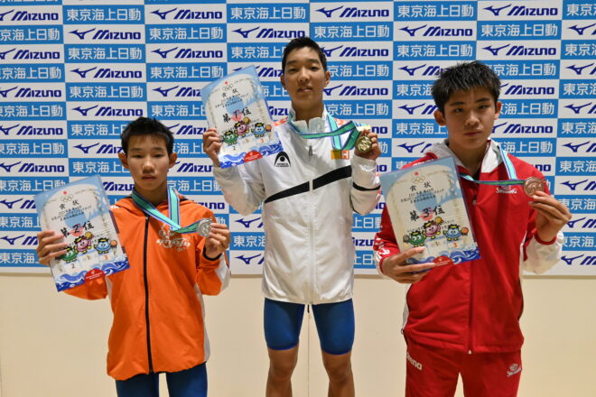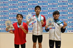 2日目は12〜13歳区分女子1m飛板飛込からスタート。1本ごとに順位が入れ替わる手に汗握る展開を制したのは、八木星輝(神奈川DC)だった。八木は制限選択飛の3ラウンド目にトップに立つも、自由選択飛に入って順位を下げてしまう。トップと11.85ポイント差で迎えた最終ラウンド。403Bで8ポイントダイブを披露して56.40を獲得して5位から逆転し、271.50で優勝を飾った。