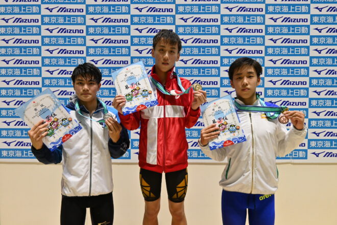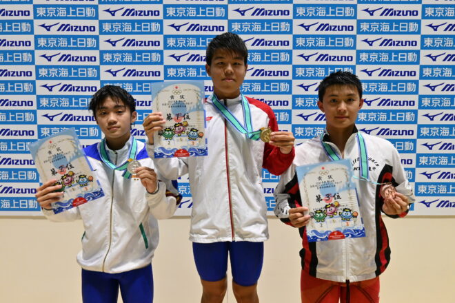 14〜15歳区分男子高飛込は、玉井陸斗(JSS宝塚)が圧倒的な演技を披露。制限選択飛の3、4ラウンド目には10ポイントを獲得し、さらに最終ラウンドの5255Bでは97.20の圧巻のダイブを見せて会場を沸かせた。合計516.65を獲得し、2位以下に100ポイント以上の差を付けて2冠を達成した。