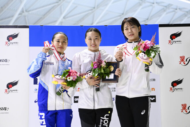 その三上とペアを組んで、世界選手権の女子3mシンクロ飛板飛込で銀メダルを獲得した金戸も、得意とする入水のキレの良さを見せ、304.40で2位に入った。303.45の3位は榎本が飛板飛込では高校時代以来となる表彰台を獲得した。