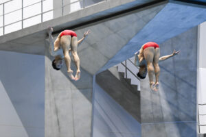 男女の3mシンクロ飛板飛込では、女子は3チーム、男子は7チームが出場。
