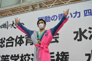 女子高飛込は予選をトップで通過した佐々木音華(米子東)が、決勝でも安定した演技を披露。制限選択飛の1ラウンド目こそトップを譲ったものの、2ラウンド目の301Bで46.55を獲得して1位に立つと、そのまま最後まで一度もトップを譲ることなく制限選択飛4本、自由選択飛5本を飛びきり、合計471.65で優勝を飾った。2位争いは接戦に。たった0.20差の勝負を制したのは、松田心杏(石川県立工業)。松田が406.80で2位、406.60の坂田丹寧(常総学院)が3位となった。