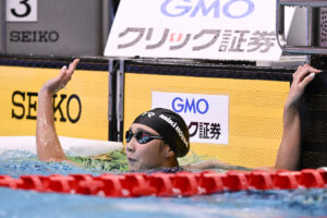 女子100mバタフライでは50mを制した相馬あい(ミキハウス)が、そのスピードを生かして先行。最後の最後に追い込んできた牧野紘子(あいおいニッセイ/東京ドームS)、飯塚千遥(筑波大学)のふたりから逃げ切り、58秒24で優勝。2位の牧野との差は100分の5秒だった。
