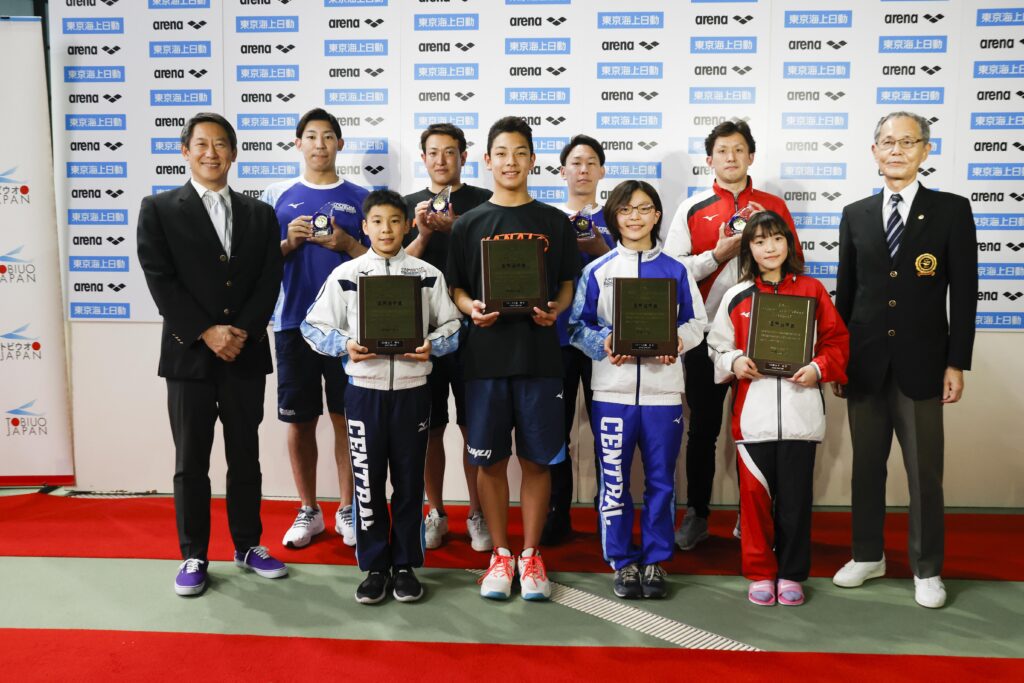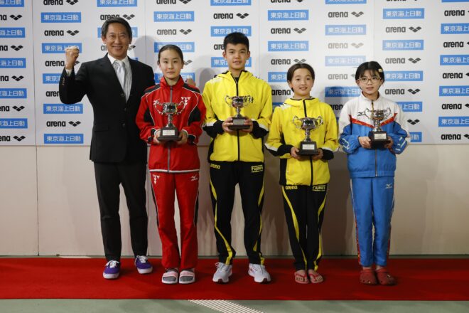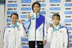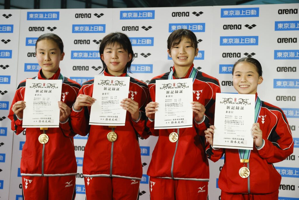 さらに11〜12歳区分女子4×50mメドレーリレーでは、貫洞友里杏、脇谷七海、櫻井あゆう、澤田倫佳の4人で挑んだ東京SCが、1分57秒55の短水路日本学童記録を更新して優勝した。