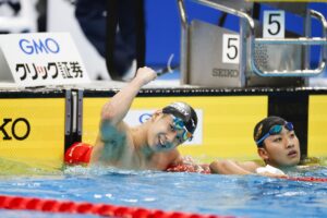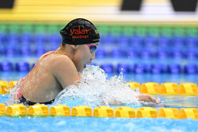 女子200m平泳ぎでは昨年から復調の兆しを見せていた今井月(バローHD/東京ドームS)が、先行する青木玲緒樹(ミズノ)を150mのターン後に捉える。青木も粘るが、今井がラスト50mでの強さを発揮して2分22秒98の自己ベストで連覇を達成した。