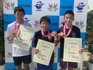 女子100m背泳ぎは中野礼依(湘洋)が1分02秒13で制し、男子は平田統也(坂出伊藤SS)が57秒31で優勝した。