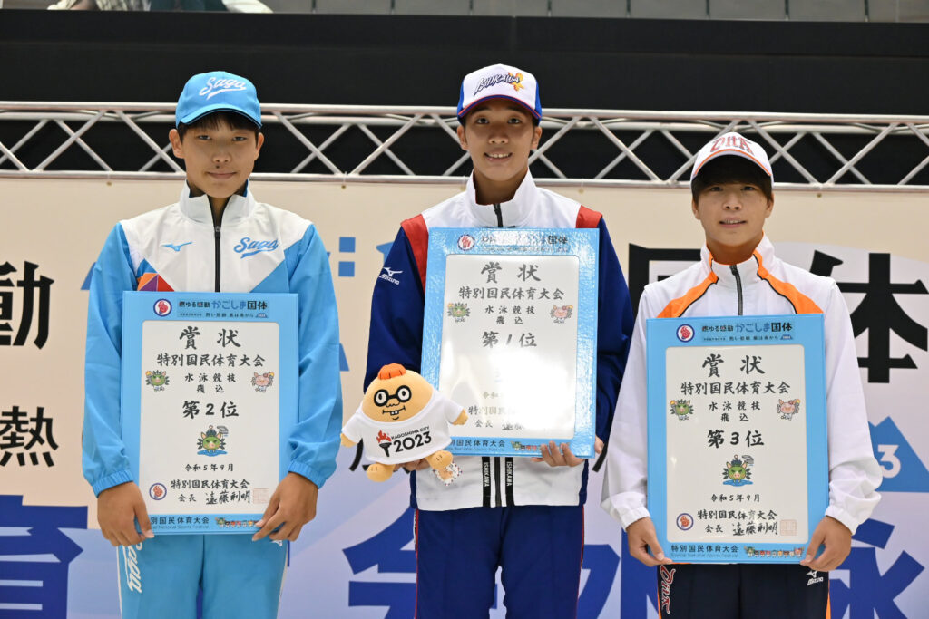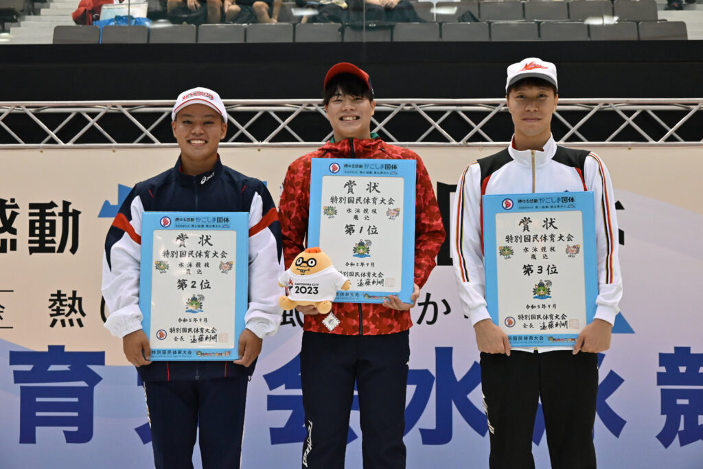 少年男子高飛込は、飛板飛込で1位を獲得した二羽倖駕(石川県)がこの種目でも強さを見せ、1ラウンド目の6243Dで70.40ポイントを獲得して好スタートを切る。その後、207Cでミスがあったものの、ほかは安定して高得点をマークし続け、329.65で1位を獲得し、今大会2冠を達成した。