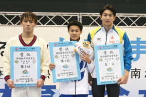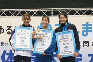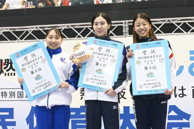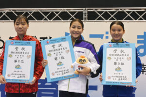 成年女子200m個人メドレーは、2位以下に2秒以上の差をつける快泳を見せた松本信歩(東京都)が2分12秒19で、インカレを覇者の廣下菜月(三重県)は成年女子100mバタフライで58秒10で1位を獲得した。