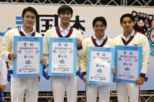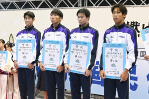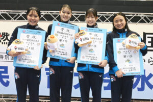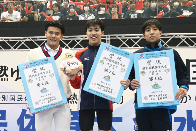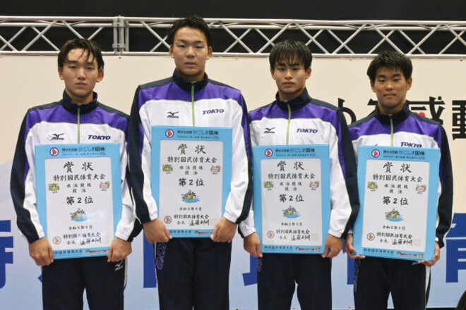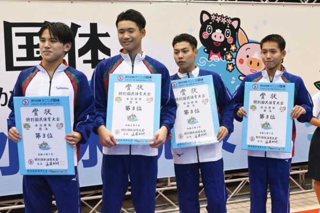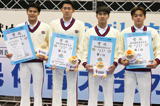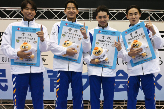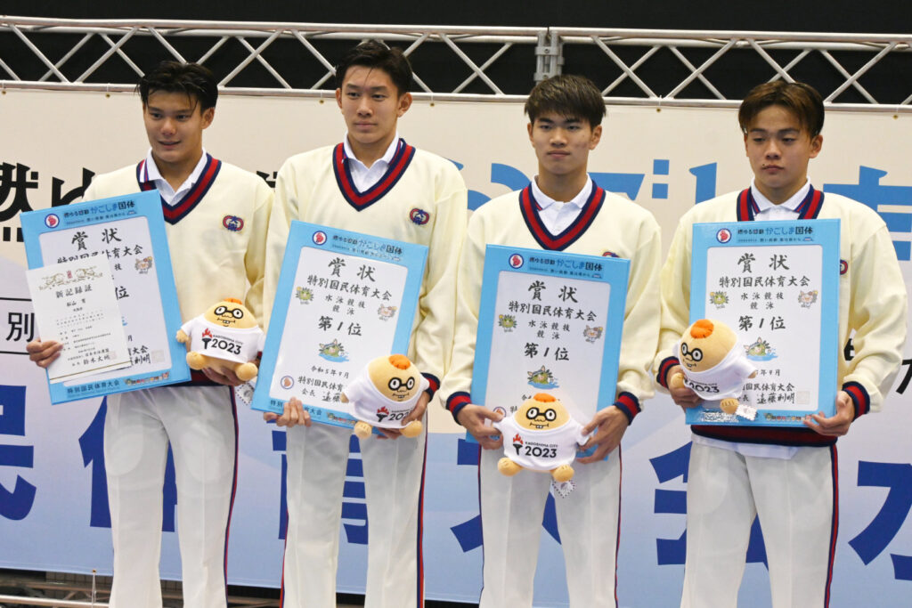 決勝では同じメンバー、同じ泳順で再度更新に臨む。まず第1泳者の堀田武蔵が、予選から記録を上げる1分50秒47の好スタート。続く村佐達也もは1分48秒98とインターハイチャンピオンの貫禄を見せる。続き西川我咲、加藤涼も1分50秒前半でまとめ、7分20秒を切る、7分19秒81の大会新記録で1位を勝ち取った。