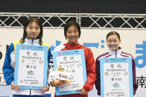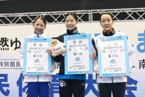 ひとつは、日本中学新記録。全国中学の50m自由形で中学記録を更新していた松山育(大阪府)が、今大会の個人種目では2位となった悔しさを晴らすように、少年B男子4×100mリレーで奮起。第1泳者で50秒46を叩き出して日本中学新記録を樹立した。さらに、チームも松山の泳ぎに刺激されたか、舟橋功、池田星那、そして安藤陽の3人も好タイムでつなぎ、3分24秒09の大会新記録で1位を獲得した。