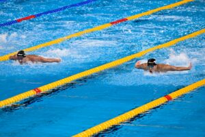男子200m個人メドレーの予選。高校生の阿部力樹とベテラン瀬戸大也のふたりが出場。瀬戸は1分58秒26、阿部は1分59秒48と、ふたりとも予選からまずまずの記録で準決勝へ。