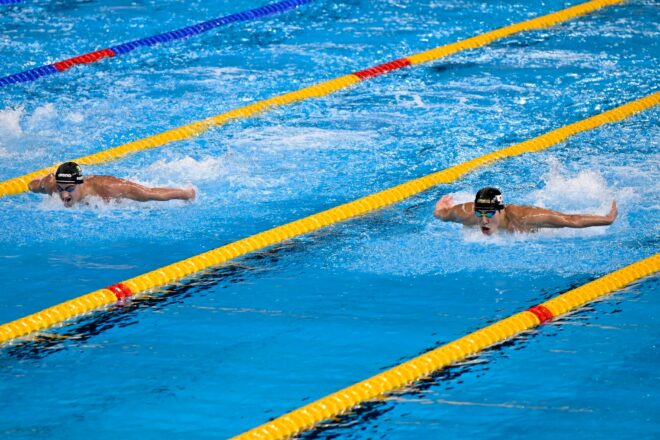 2位で決勝に進んでいた本多灯は、気合い十分の表情で入場。ライバルとなるイタリアのRAZZETTI Albertoがスタートから飛び出し、50mのスプリットを奪う。それに続く形で本多が2番手でターン。そこから徐々にRAZZETTIに迫ると、100mで逆転。53秒90のトップを奪って前半を折り返す。