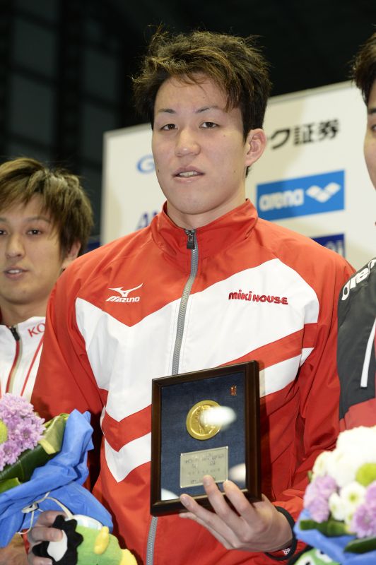1秒にも満たない間に8人がひしめき合った男子の100m平泳ぎを制したのは、初優勝の小関也朱篤選手(ミキハウス)。59秒、58秒を目標にしていたという小関選手でしたが、1分00秒07という結果に、「後半ばててしまった。優勝できたうれしさよりも悔しさのほうが大きいですが、明日の50mではタイムを狙いたい」と気持ちを新たに、明日のレースに挑みます。