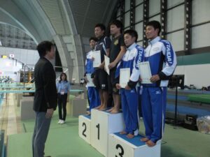 男子3mシンクロナイズドは、新良貴優(福山平成大学)と小林和真(茗水会)組が優勝。2位は長谷川英治(日本体育大学)、遠藤正人(日本体育大学)組が入り、関口大輝(日本体育大学)、後藤福寿(日本体育大学)組が3位となりました。