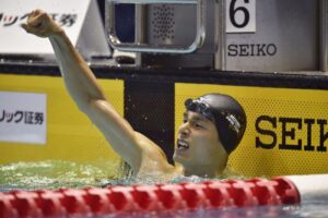 「30秒台も見えて、緊張しましたけど、楽しめた気がします。今まではただ単に、焦って泳ぎのテンポが上がるだけだったのが、落ち着いてパワーを活かせるようになって、スピードが出るようになりました」と、持ち味のスピードが戻ってきた感触をつかんでいました。