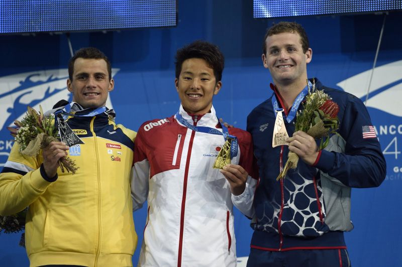 男子200m自由形では、萩野公介選手が最後まで地元オーストラリアのトーマス・フレーザーホームズ選手と接戦を演じ、最後はタッチ差で敗れましたが1分46秒08で銀メダルを獲得。