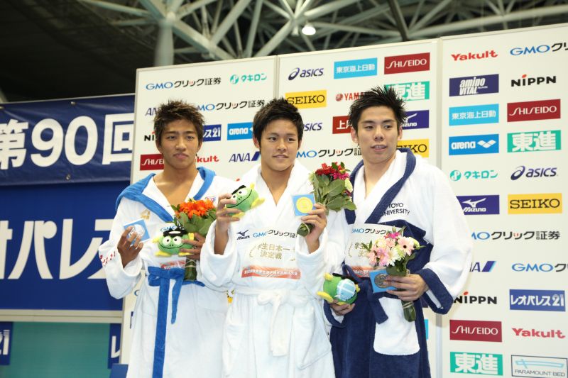 50mで日本記録を更新した内田選手を第1泳者に置き、54秒42の100m自由形の大会記録を更新してスタートした東洋大学が、400mフリーリレーで3分42秒56の大会新記録で逃げ切って優勝を果たしました。男子同種目は、中央大学と日本大学がアンカー勝負となり、3分19秒11で接戦を制したのは中央大学でした。