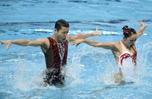 今大会から初の開催となったミックスデュエットもフリールーティンの決勝を迎えます。テクニカルルーティンで優勝した、男子シンクロ界では非常に有名なアメリカのビル・メイ選手や、ソリストとして衝撃的な一時代を築いたフランスのヴィルジニー・デデュー選手のミックスでの復帰など、見どころはたくさんありました。