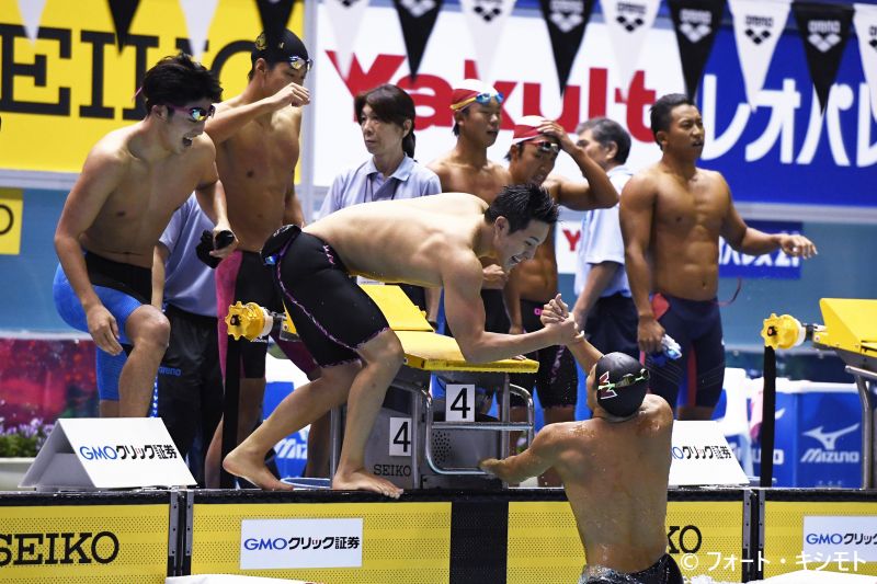 その30分後、男子4×100mメドレーリレーで、萩野選手と瀬戸選手はふたりとも第1泳者の背泳ぎを担当し、再度の対戦。背泳ぎが得意な萩野選手は53秒08で第2泳者に引き継ぎます。反対に、背泳ぎを苦手としている瀬戸選手でしたが、こちらも53秒98という好記録で第2泳者の渡辺一平選手にバトンタッチ。瀬戸選手、渡辺選手、そしてバタフライには坂井選手とオリンピアンを3人そろえている早稲田大学が、萩野選手率いる東洋大学を先行し、最後の自由形でも荒木優介選手がきっちりと逃げ切って3分35秒00の大会新記録で、早稲田大学が優勝しました。