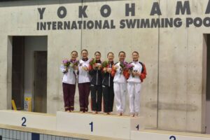 デュエットには、リオデジャネイロ五輪代表の小俣夏乃選手(国士舘大学)が出場。その小俣選手とペアを組む北浜美波選手(国士舘大学)も、日本シンクロチャレンジカップ2016のソロで2位を獲得している選手。実力者ふたりを要する国士舘大学が84.8000で優勝しました。