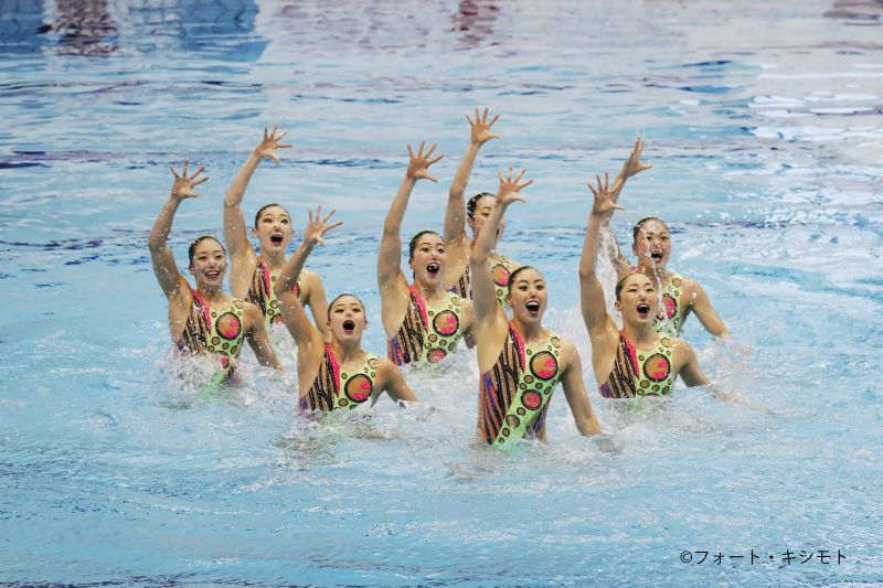 チームのテクニカルルーティンでは、日本が『弥栄日本』をテーマに、和を全面に出した演技ながら、きっちりとルーティンもこなしていきます。最後まで大きな乱れはなく泳ぎ切り、91.5684で1位を獲得。大会3日目のフリールーティンに良い流れでつなぎました。
