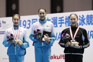 JAPAN OPEN 2017と同時開催されている、第93回日本選手権水泳競技 シンクロナイズドスイミング競技では、1位から3位までが163点台という接戦。優勝したのは、テクニカルルーティンで1位だった安永真白選手(井村シンクロクラブ)をフリールーティンで逆転した、大屋希良々選手(井村シンクロクラブ)。163.9199での初優勝を果たしました。安永選手は、163.6741で2位となり、3位は吉田萠選手(ザ・クラブピア・88)が163.2576で入りました。