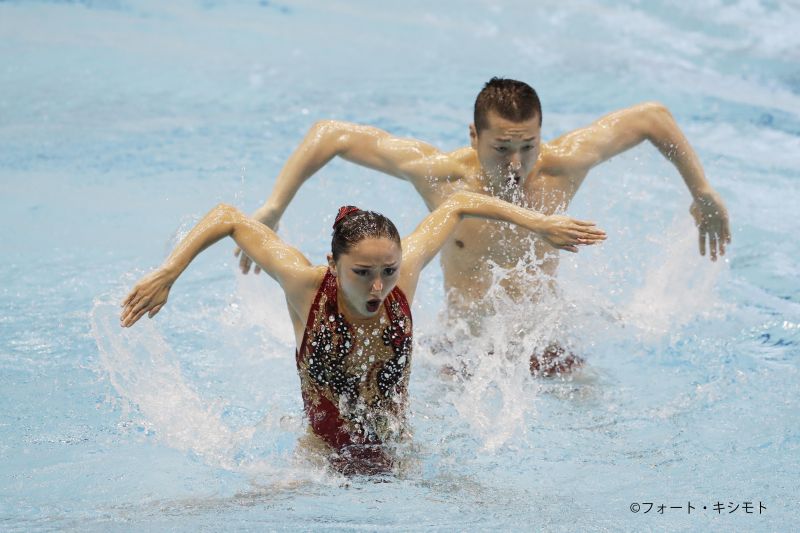 ミックスデュエットに出場したのは、ハンガリー・ブダペスト世界水泳選手権代表の足立夢実選手・安部篤史選手ペア。2年前、この大会にエキシビジョンとして披露した演技とは全く異なる、きれいに“シンクロ”した演技を見せてくれます。