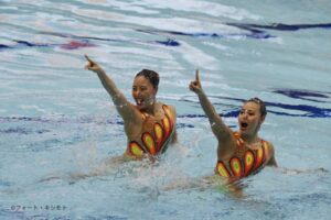 また、デュエットのテクニカルルーティンでは、昨日のソロで初優勝を飾った大屋希良々選手と2位の安永真白選手(ともに井村シンクロクラブ)のペアが、81.4068で好スタートを切り、明日のフリールーティンに臨みます。
