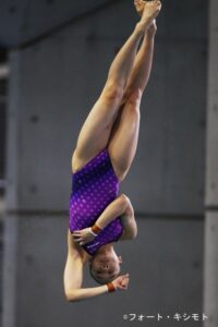 女子3m飛板飛込には、2月の国際大会代表選手選考会で優勝した金戸凜選手(セントラルD/日出中学)に注目が集まりますが、金戸選手を10ポイント近く上回る69.00をマークし、一本目でトップスタートを切ったのは宮本葉月選手(土佐女子/高知SC)。