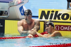 男子100m平泳ぎでは、アダム・ピーティー(イギリス)が準決勝で56秒88という驚異的な世界新記録を樹立。その横で泳いだ小関也朱篤は、ピーティーのスピードに惑わされることなく自分のペースを貫き、58秒89で予選よりもタイムを上げて、4位で決勝に駒を進めた。